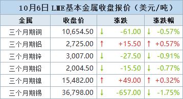 伦敦时间10月6日17:00(北京时间10月7日00:00),LME三个月期铜下跌61美元,或0.57%,收报每吨10,654.5美元。该合约此前曾触及5月份以来的最高点10,800美元。周一的最高点代表着自4月初以来近25%的涨幅。