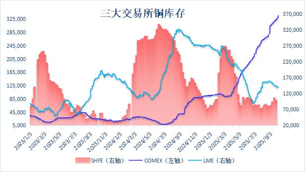 此前市场担忧美国征收范围不及预期的对铜关税落地后,更多铜向非美地区流入,且不排除美国当地铜流出,但是截至最新数据显示COMEX铜库存持续累积,升至33万吨之上,更多铜库存开始显性化,而LME铜库存则延续小幅去化势头,最新落至14万吨之下。国庆假期之前,受铜价突破影响,国内下游需求受到抑制,表现旺季不旺,假期期间下游加工企业基本放假,预计国内铜社会库存会继续累积,需关注假期期间累库幅度和节后需求表现。