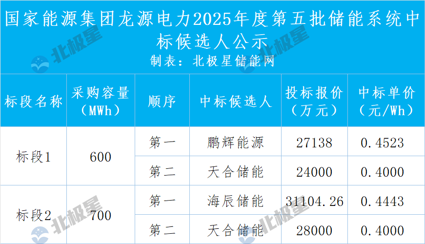 北极星储能网讯:9月29日,国家能源集团龙源电力第五批储能电池系统集采中标候选人公示,鹏辉能源与海辰储能分别预中标600MWh和700MWh标段。