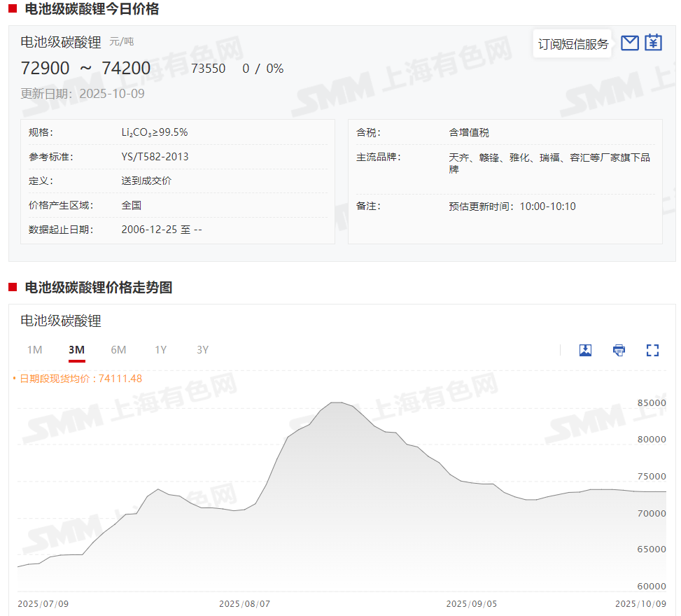 截至10月9日,电池级碳酸锂现货报价暂时持稳于72900~74200元/吨,均价报73550元/吨。