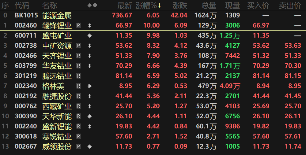 SMM 10月9日讯:10月9日早间开盘,受假期海外消息刺激,国内能源金属板块开盘跳涨,延续了自9月24日以来维持的涨势,盘中指数一度涨近6%,最高上探至735.95的高位,刷新2023年2月以来的逾两年新高。个股方面,赣锋锂业、盛屯矿业涨停,中矿资源、天齐锂业、华友钴业、腾远钴业等多股涨逾6%。