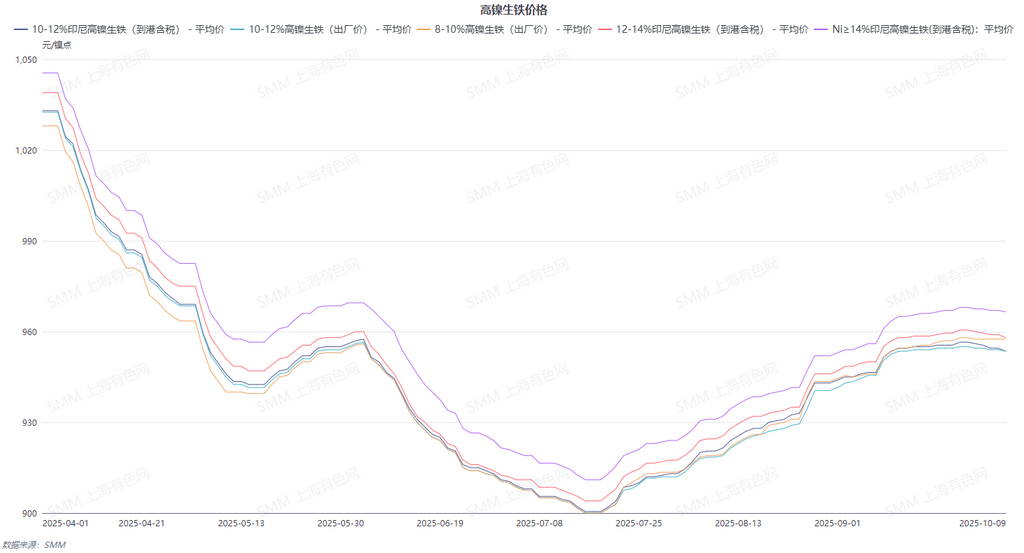 国庆节后,截至2025年10月9日,SMM10-12%高镍生铁(出厂含税)均价环比下滑0.5元/镍点至953.5元/镍点,SMM10-12%高镍生铁(到港含税)均价环比下滑1元/镍点至953.5元/镍点。节后高镍生铁价格延续跌势,国庆节内市场有何变动,对后市预期如何表现?以下为具体分析: