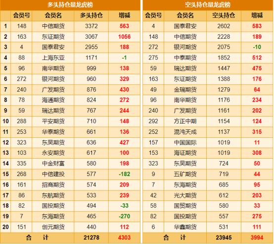 广发期货和东吴期货席位增持多单均超400手,同时小幅增加空单,表现为净空单分别减少228手和377手。海通期货、招商期货、东航期货席位只有多单上榜,分别增持272手、209手和239手。东海期货减多加空,净空单增加365手,由多翻空。