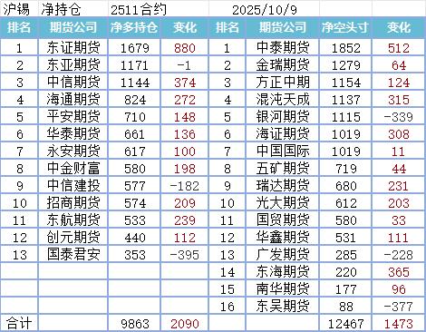 国庆假期期间,受海外流动性宽松预期提振,有色金属全面飘红,铜价再创阶段新高。受外盘和相关品种带动,叠加近期印尼严打非法采矿加剧供应担忧,节后首日国内沪锡大幅走高,主力合约收涨2.99%,报287090元/吨,刷新半年高位。成交量虽然较节前有显著下滑,但持仓量大幅提升,主力sn2511合约排名前20持仓龙虎榜上,多头合计加仓4303手,空头增仓3994手,多空双方势均力敌。