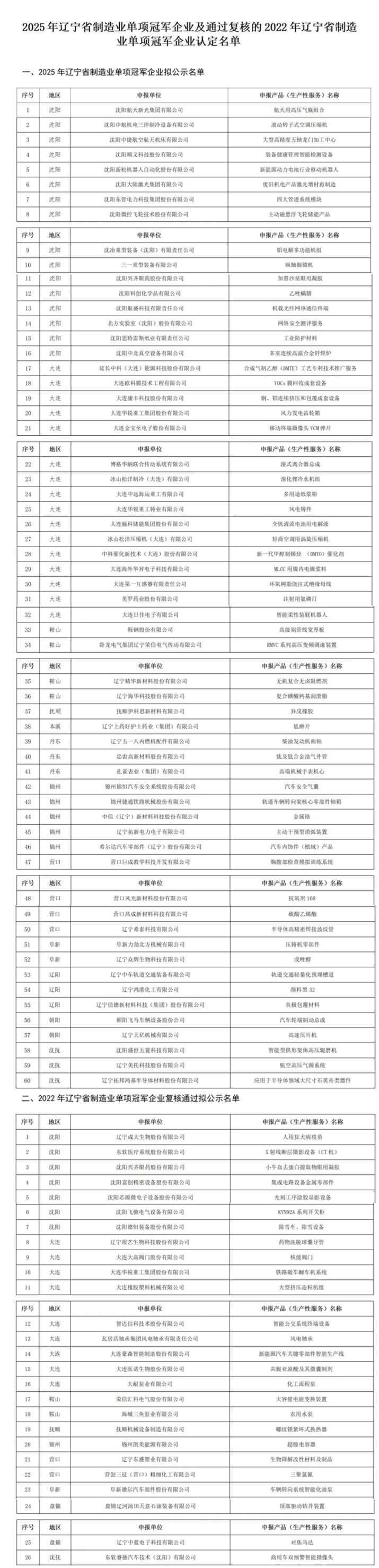 关于公布2025年辽宁省制造业单项冠军企业及通过复核的2022年辽宁省制造业单项冠军企业名单的通知