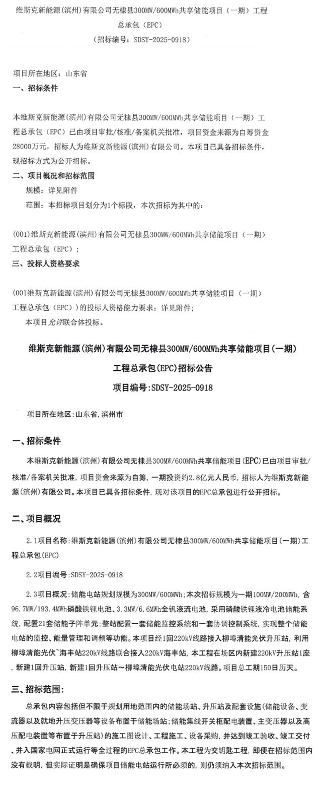 北极星储能网讯:9月30日,维斯克新能源(滨州)有限公司山东无棣县300MW/600MWh共享储能项目(一期)EPC招标发布,项目资金来源为自筹资金28000万元,折合单价约1.4元/Wh。招标人为维斯克新能源(滨州)有限公司,是中能绿投(山东)新能源产业有限责任公司旗下子公司。