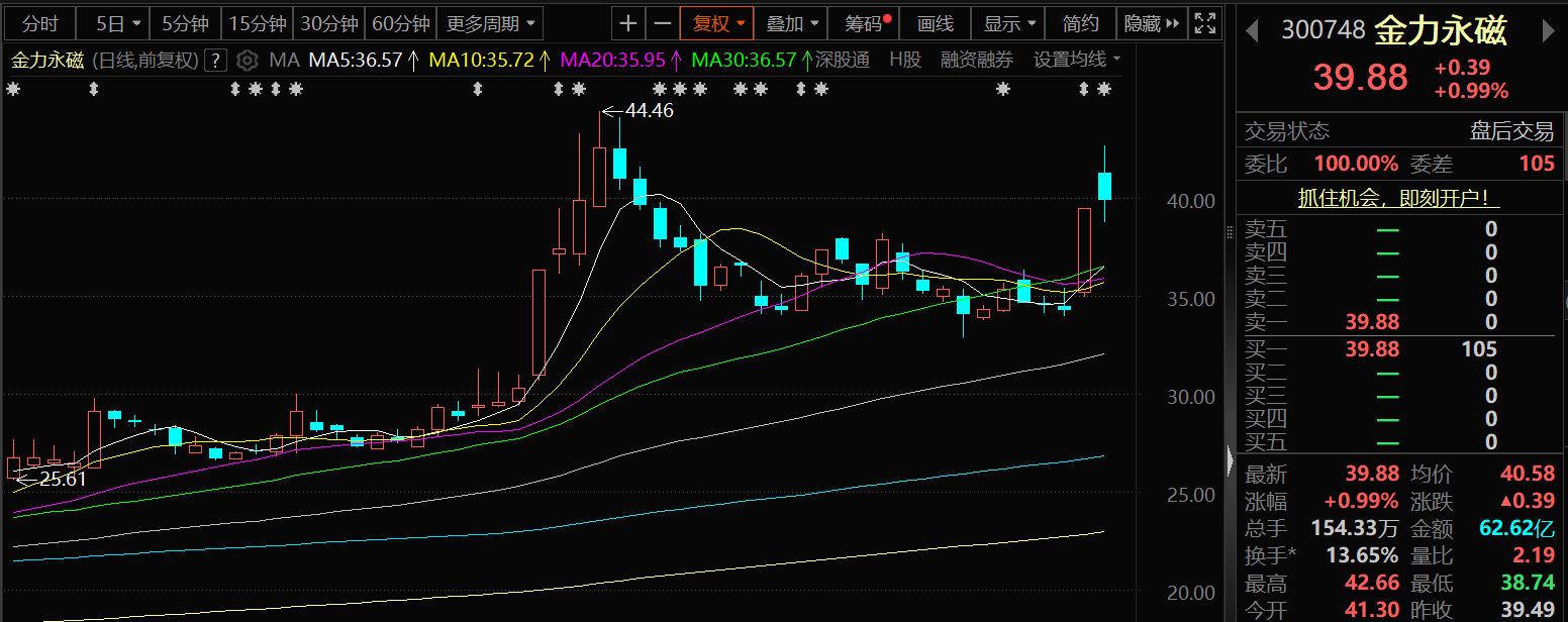 10月10日,金力永磁股价逆势上涨,截至10日收盘,金力永磁涨0.99%,报39.88元/股。