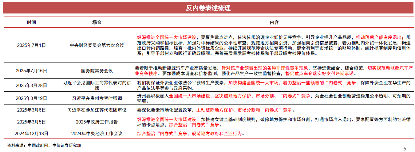 ➢2025年 7月中央财经委员会第六次会议召开,会议强调,纵深推进全国统一大市场建设,要聚焦重点难点,依法依规治理企业低价无序竞争,引导企业提升产品品质,推动落后产能有序退出