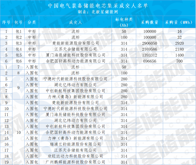 值得注意的是,中国电气装备今年初已经开展了超7.2GWh储能电芯集采,覆盖50Ah、100Ah、280Ah、314Ah电芯以及电芯入围框采,总采购量超过7248MWh。最终8月公布的中标结果显示,楚能新能源中标夺得最大标包2920MWh,天合储能中标总额2180MWh,海辰储能中标总额1400MWh,国轩高科中标额700MWh。除了上述四家企业外,还有另外七家企业共同进入了入围名单,其中宁德时代、亿纬动力、中创新航、力神同时入围了280Ah和314Ah两个标段的集采标包,欣旺达动力、瑞浦兰钧、鹏辉能源也入围了314Ah标段。