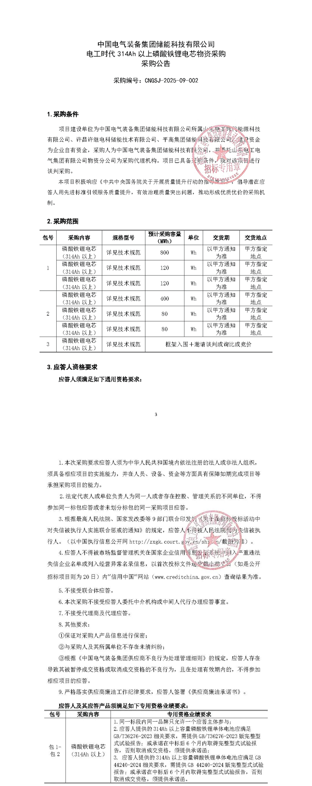 中国电气装备集团储能科技有限公司电工时代314Ah以上磷酸铁锂电芯物资采购采购公告
