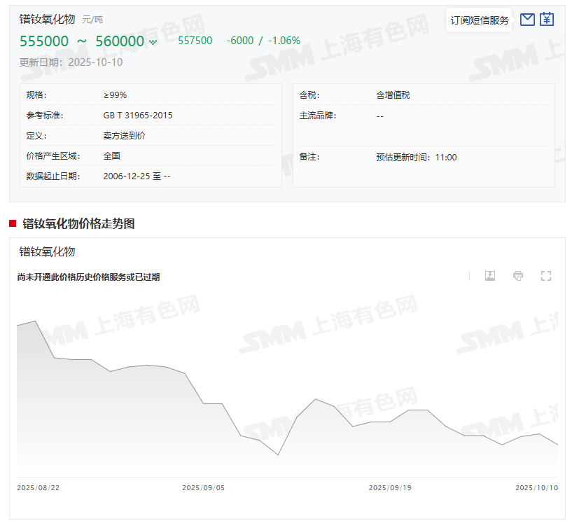 据SMM报价显示,氧化镨钕10月10日的价格为555000~560000元/吨,其均价为557500元/吨,较前一交易日下跌1.06%。目前,稀土市场价格整体偏弱运行,主要缘于镨钕市场的需求未见明显改善。磁材企业的订单状况没有明显好转,加之节前已完成采购补库,使得当前金属库存较为充足,导致市场询单活动减少。但在氧化物成本支撑下镨钕金属价格仍保持相对稳定。然而,金属市场需求疲软传导到上游氧化物市场,造成高价氧化镨钕成交困难,促使其价格出现小幅下调。总体来看,尽管有宏观政策消息发布,但由于磁材企业订单情况未见好转,对金属的需求减弱,进而使得整个稀土产业链的价格走势偏弱。预计短期内,在缺乏显著需求增长的情况下,稀土市场价格可能会继续偏弱运行。