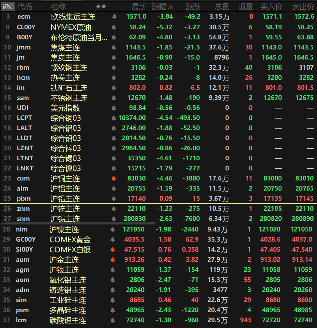 上周五隔夜内外盘金属近全线下跌,仅沪铅唯一上涨0.09%,伦铜、沪铜齐齐跌超4%,伦铜跌4.54%,沪铜跌4.46%。沪锡跌2.63%,伦铝、伦镍、沪锌以及沪镍、沪铝一同跌超1%,伦铝跌1.88%,伦镍跌1.79%,沪铝跌1.59%,沪锌跌1.23%,沪镍跌1.98%,其余金属跌幅均在1%以内。氧化铝主连跌2.47%,铸造铝主连跌1.91%。