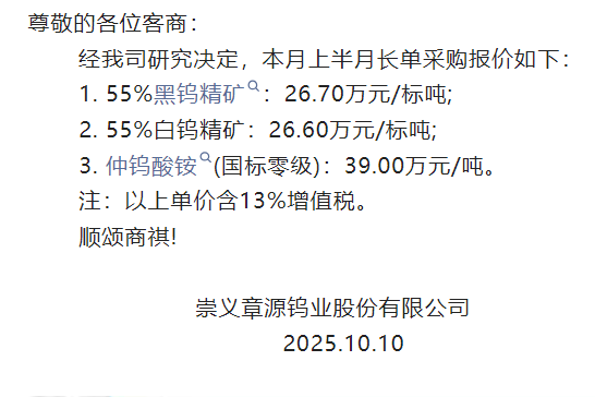 据崇义章源钨业10月10日消息:崇义章源钨业股份有限公司10月上半月的长单采购报价如下:1. 55%黑钨精矿:26.7万元/标吨,较上轮报价下调0.5万元/标吨;2. 55%白钨精矿:26.6万元/标吨,较上轮报价下调0.5万元/标吨;3. 仲钨酸铵(国标零级):39万元/吨,较上轮报价下调1万元/吨。