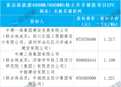 第一中标候选人是中振建设有限公司牵头人的联合体,联合体成员中城恒业设计集团有限公司,报价1.221元/Wh;