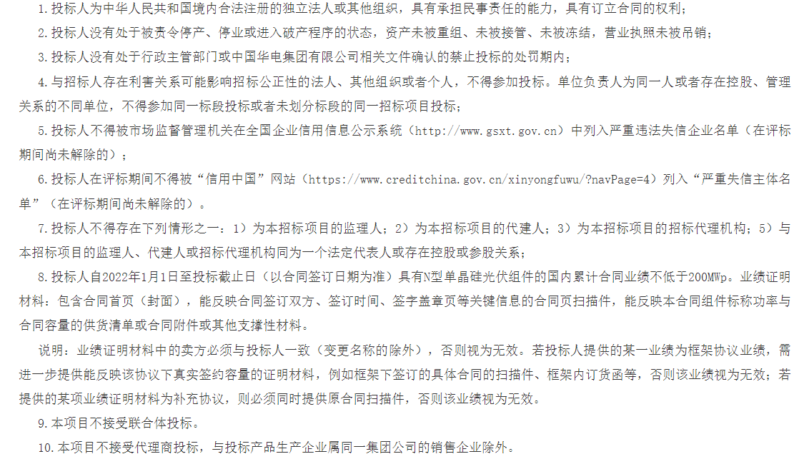业绩方面,此次招标要求投标人自2022年1月1日至投标截止日(以合同签订日期为准)具有N型单晶硅光伏组件的国内累计合同业绩不低于200MWp,对于B标段未提出单独的BC产品销售业绩要求,为刚刚进入BC领域的企业提供参与机会。项目不接受联合体投标,不接受代理商投标(与投标产品生产企业属同一集团公司的销售企业除外)。