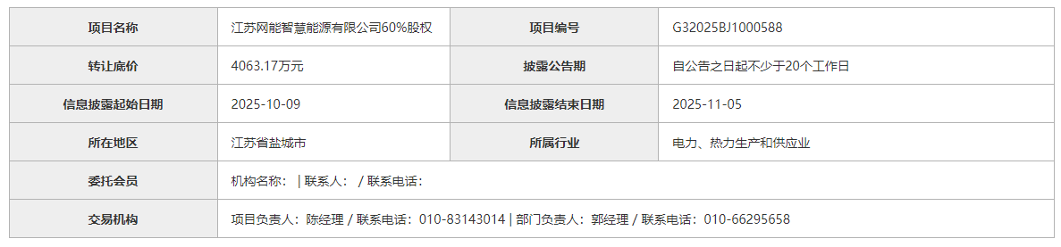 10月9日,国网综合能源服务集团有限公司转让江苏网能智慧能源有限公司60%股权,转让底价4063.17万元。