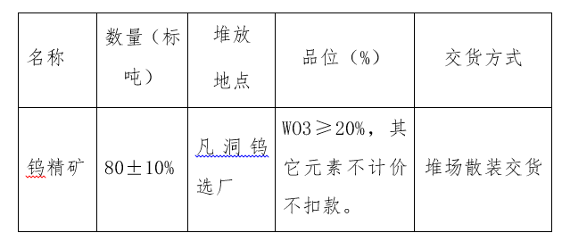 二、竞价后我公司只对含钨和水份进行检测,其他元素指标不作检测。同时,中标单位需在提货前足额支付钨精矿货款。