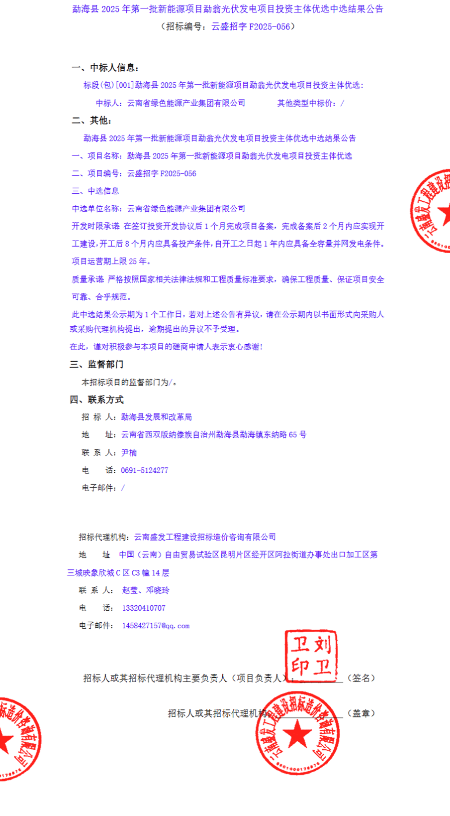10月11日,勐海县2025年第一批新能源项目勐翁光伏发电项目投资主体优选中选结果公布,中标企业为云南省绿色能源产业集团有限公司。