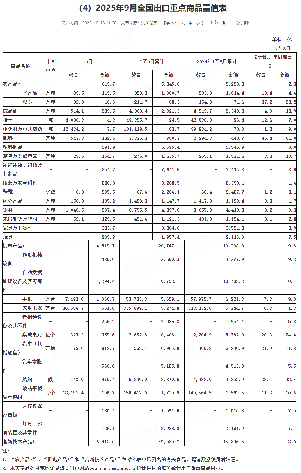 海关总署副署长王军表示,前三季度,我国出口机电产品12.07万亿元,增长9.6%,占出口总值的60.5%,提升了1.4个百分点。其中,出口电子信息、高端装备、仪器仪表等高技术产品分别增长8.1%、22.4%和15.2%;“新三样”产品、铁道电力机车等绿色产品增速均达到两位数。