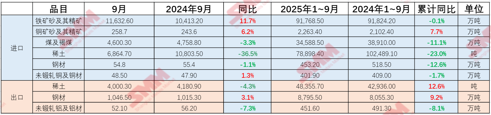 2025年9月铁矿砂及其精矿进口11,632.6万吨,同比2024年9月增加11.7%。2025年1~9月累计进口91,768.5万吨,同比2024年1~9月减少0.1%。