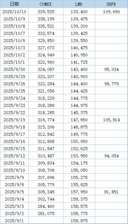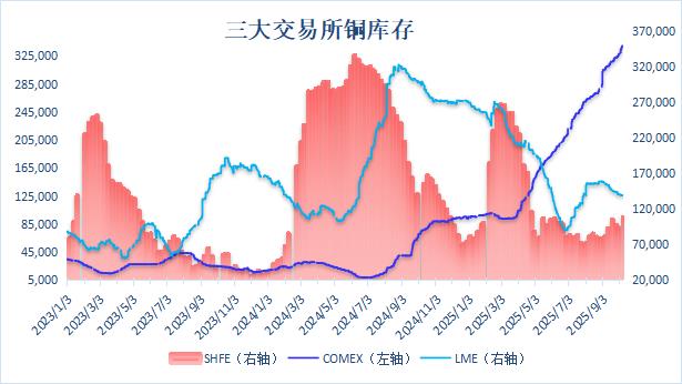 以下为2025年9月以来三大交易所铜库存数据:(单位:吨)