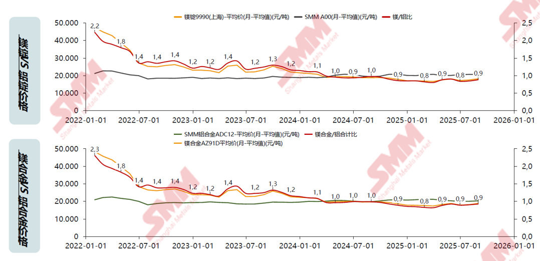 2025上半年镁铝平均价格比仅0.878 ,当前镁具有更高的性价比