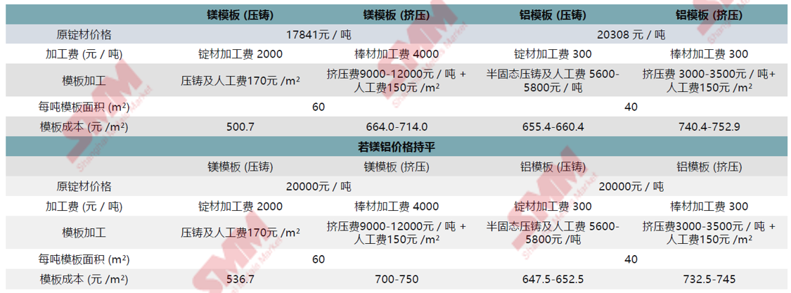 据SMM分析,2025上半年镁铝平均价格比仅0.878 。以建筑行业2022年数据为例,每平方米镁模板压住/挤压产品成本分别为500.7元、664.0-714.0元,对应铝模板产品为655.4-660.4、740.4-752.9元,终端产品成本优势显著。加工后每千克镁合金产品成本在30.04-42.84元,铝合金为26.22-30.12元,但镁合金密度约为铝合金的2/3,因此对于同一压铸产品,镁合金加工后成本约低31%左右。