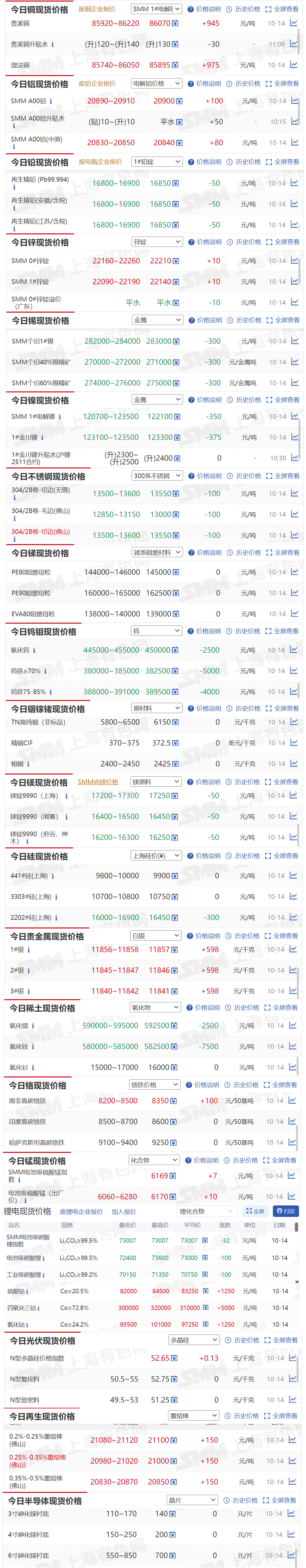 ►10月14日上海市场铜现货升贴水(第四时段)【SMM价格】