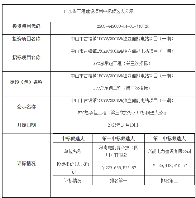 第一中标候选人为深南电能源科技(四川)有限公司,投标报价229,635,525.87元,折合单价1.148元/Wh;