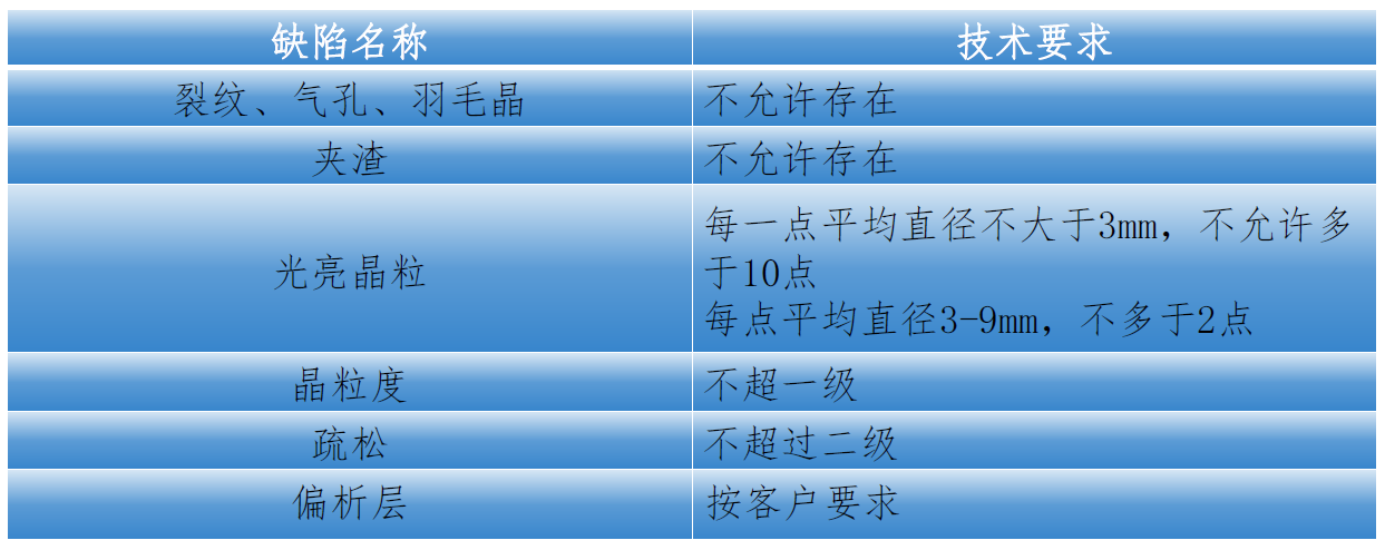 3、直径小于300mm的铸锭,表面允许存在深度不大于1.0mm的拉痕、成层(冷隔)、缩孔等缺陷。