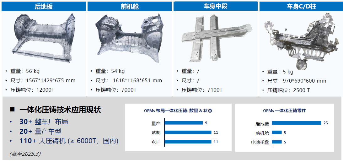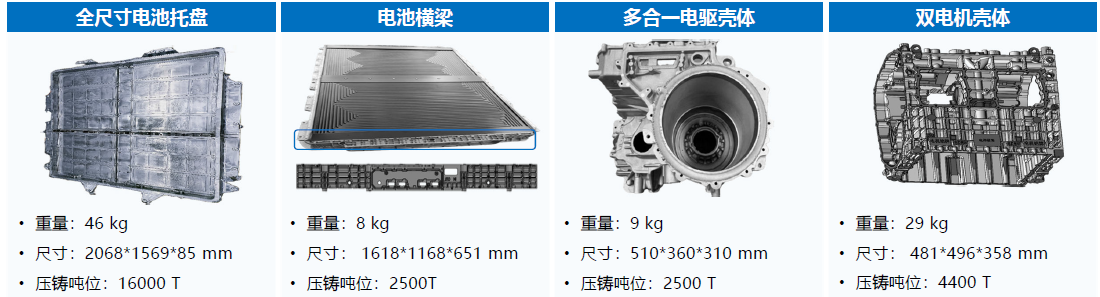 包括仪表盘支架、座椅骨架、多合一电驱壳体,电池横梁等。