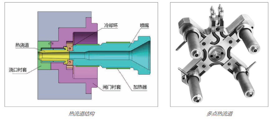 镁合金热流道:热流道系统是喷嘴的延伸,从喷嘴到模具的浇口都保持一定的温度状态,让流道中的融料一直处于熔融的状态。
