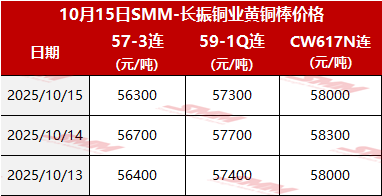 【SMM价格】2025年10月15日长振黄铜棒价格