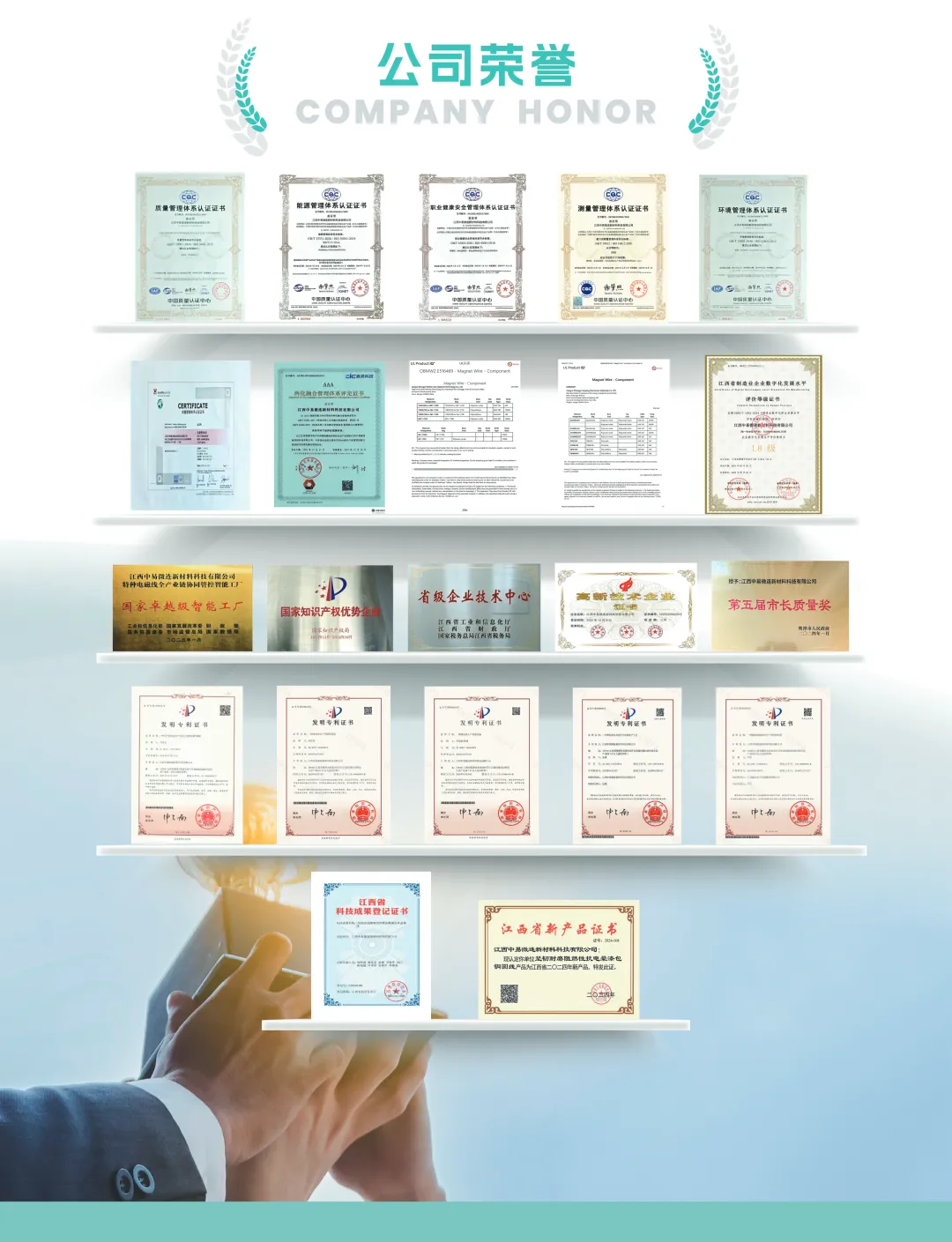 荣获:国家高新技术企业、国家级绿色工厂、工信部2023年度智能制造示范工厂、卓越级智能工厂、工信部2021年度智能制造优秀场景、智能制造能力成熟度3级、数字化转型成熟度3星级、数据管理能力成熟度3级、2021年江西省“专精特新”中小企业、江西省瞪羚企业、2022年度鹰潭市雏鹰企业、2020年江西省智能制造标杆企业、江西省信息化和工业化融合示范贯标企业、江西省名牌产品、江西省赣出精品企业、江西省“小灯塔”培育企业、鹰潭市市长质量奖;江西省企业技术中心、鹰潭市企业技术中心、鹰潭市特种电磁线技术创新中心。