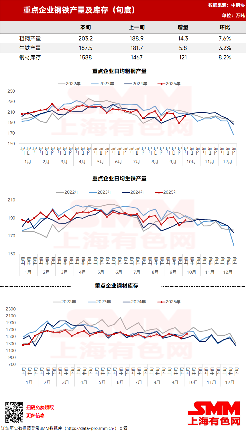 粗钢日产203.2万吨,日产环比增长7.5%;生铁日产187.5万吨,日产环比增长3.2%;10月上旬,重点统计钢铁企业钢材库存量1588万吨,环比上一旬增加121万吨、增长8.2%。