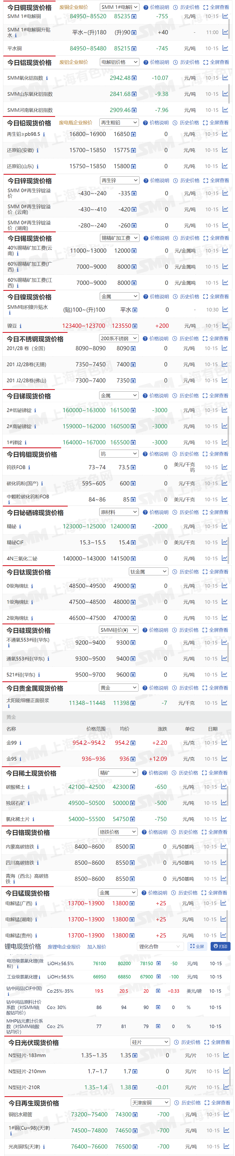 ►10月15日上海市场铜现货升贴水(第四时段)【SMM价格】