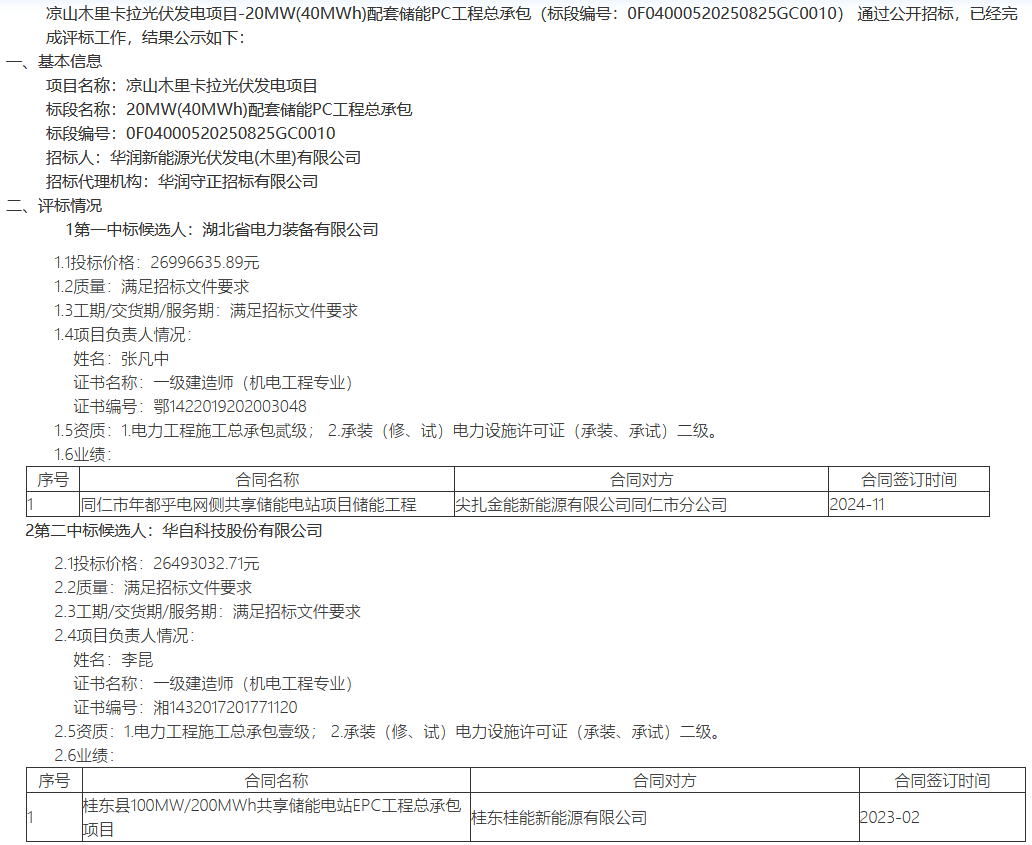 第二中标候选人:华自科技股份有限公司,投标价格:26493032.71元,折合单价0.662元/Wh。