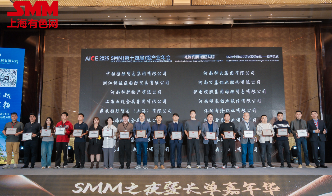 为了进一步完善报价体系,SMM经过一段时间的调研,对2025 SMM中原A00铝锭、低碳铝采标单位再度进行扩充,并在AICE 2025 SMM (第十四届)铝产业年会的晚宴环节上举行了隆重的授牌仪式!