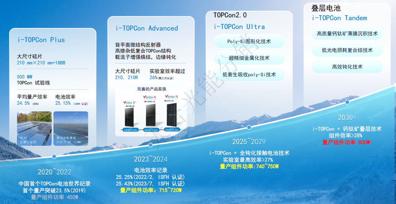 随着双面全钝化接触、抑制光学寄生吸收及超细栅线等技术的导入应用,未来天合光能i-TOPCon技术还拥有巨大的功率提升空间。
