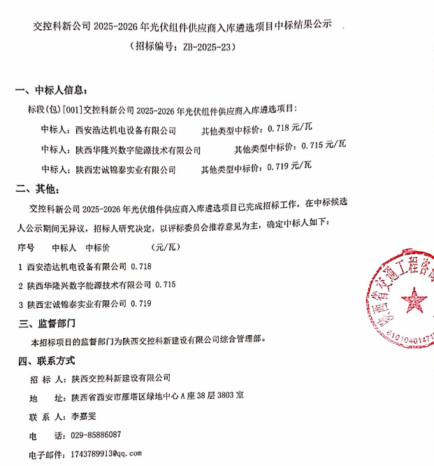 10月15日,交控科新公司发布2025-2026年光伏组件供应商入库遴选项目中标结果公示。