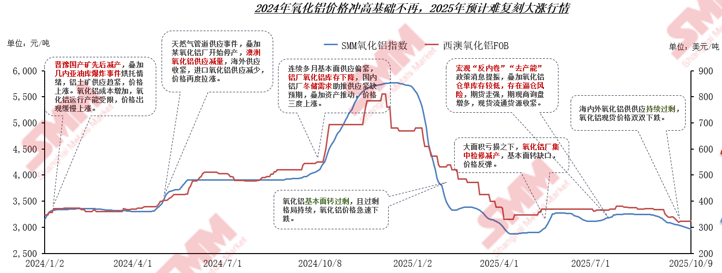 2025年Q4:9月氧化铝进口窗口开启,预计进口供应增加;叠加国内产能过剩且铝土矿供应充裕难限制其生产,SMM预计氧化铝整体或延续过剩格局,现货价格或继续围绕成本线波动。