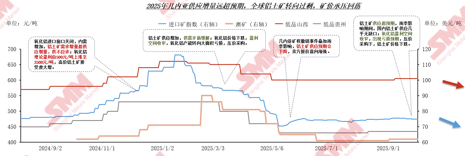 2025年6-8月:几内亚事件提振下,叠加几内亚发运量降低开始在国内进口铝土矿供应方面体现,持货方挺价意向逐渐增强;2025年9月:国内氧化铝盈利空间收缩,压价采购意向渐强,叠加铝土矿基本面过剩,铝土矿价格承压回落;