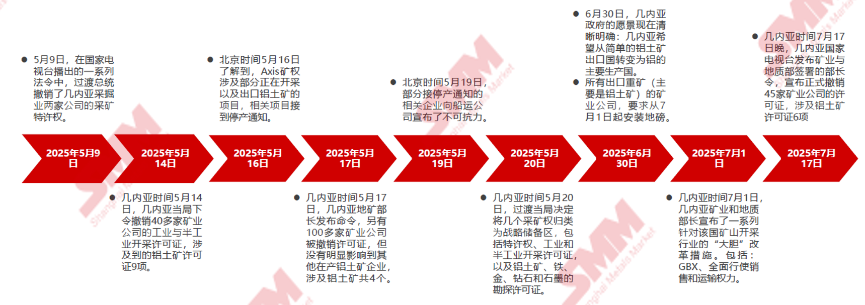 2025年5月起,几内亚铝土矿政策频出,对于给中国氧化铝市场情绪增添波澜。从长期角度看,几内亚预计将发展国内铝工业,由单纯的铝土矿出口国转向铝生产国;中长期看,几内亚若严格执行GBX、全面行使销售和运输权利等,几内亚铝土矿生产成本预计上涨,支撑几内亚铝土矿价格上行;短期内,铝土矿基本面转向明显过剩,矿价承压回落。
