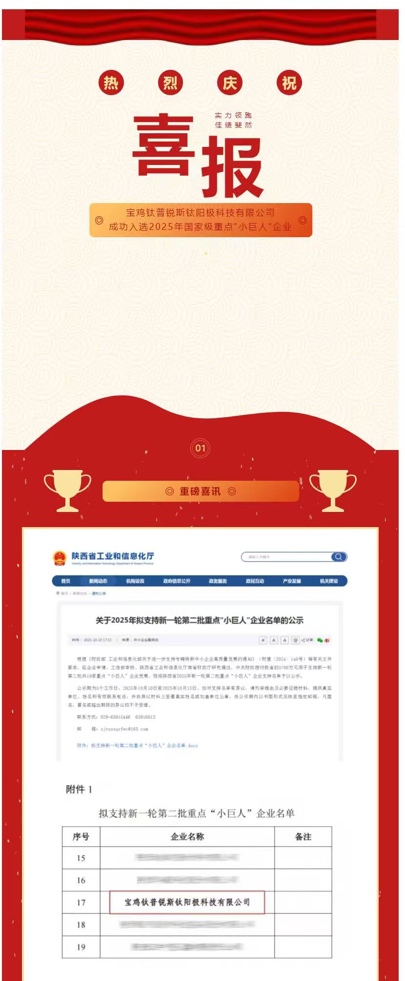 喜讯!近日,陕西省工业和信息化厅公示了2025年新一轮第二批重点“小巨人”企业名单。经过层层遴选与严格评审,宝鸡钛普锐斯钛阳极科技有限公司通过认定,荣列榜单!