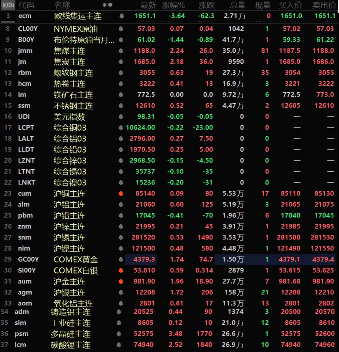贵金属方面,隔夜COMEX黄金涨3.4%,10月17日早间开盘后继续拉涨,盘中最高冲至4392美元/盎司,续刷其上市以来的历史新高;COMEX白银涨3.99%,10月17日早间持续上行,盘中最高一度上涨至53.765美元/盎司,同样刷新其上市以来的历史高位。国内方面,沪金涨1.96%,盘中最高冲至984.18元/克,继续刷历史新高;沪银涨1.72%,其盘中最高冲至12366元/千克,同样刷新其历史记录。