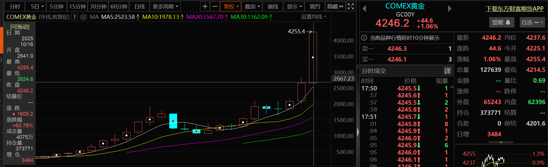 截至10月16日18:01分,COMEX黄金涨1.06%,盘中刷新历史新高至4255.4美元/盎司,其今年以来的年线涨幅暂时为60.95%。