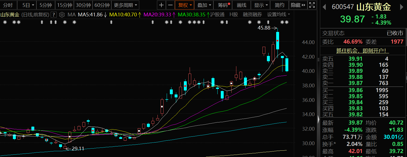 10月16日,山东黄金股价出现下跌,截至16日收盘,山东黄金跌4.39%,报39.87元/股。