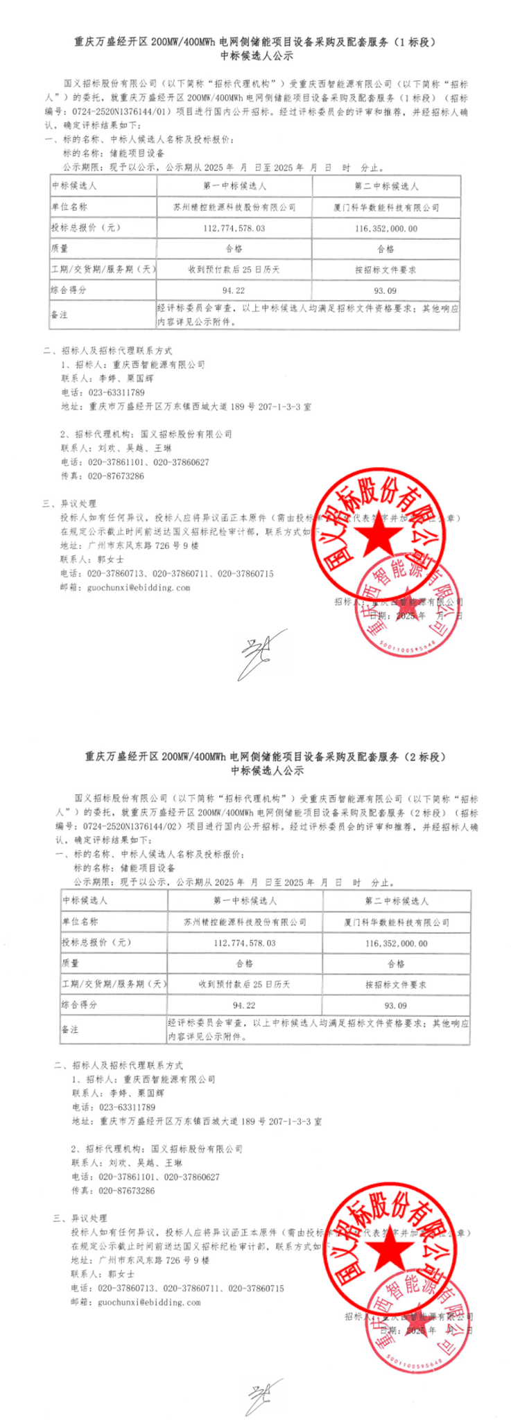 1标段第一中标候选人为苏州精控能源科技股份有限公司,投标总报价112774578.03元,约合0.56元/Wh;第二中标候选人为厦门科华数能科技有限公司,投标总报价为116352000元,约合0.58元/Wh。