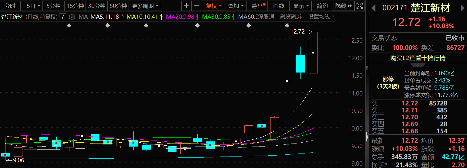 10月16日,楚江新材的股价以涨停报收,至此其已经收获了3天2板。