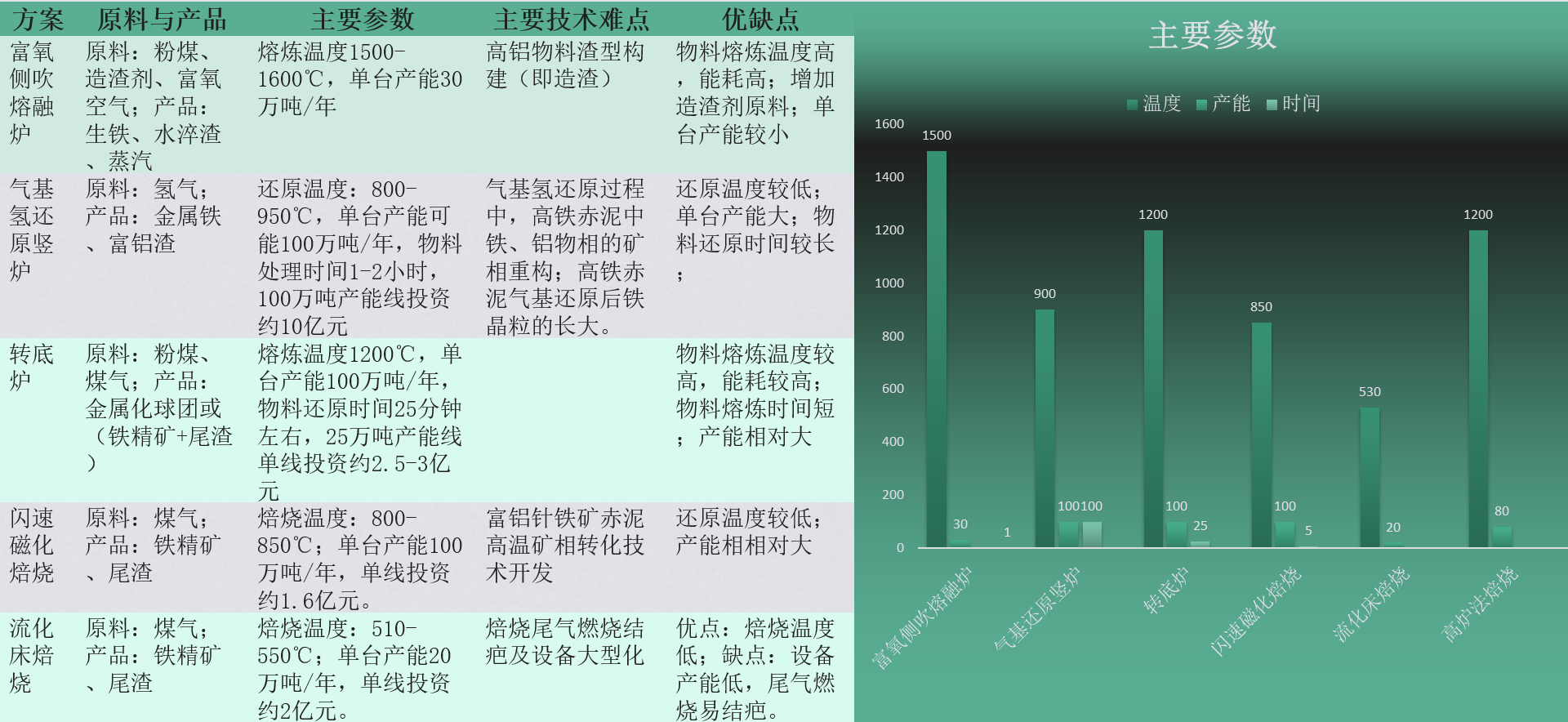 高炉法/富氧侧吹熔融炉:能耗高,高炉法产能大,富氧侧吹产能小,还原介质均含煤气、粉煤,投资各异,难点分别为煤气回收率不足等与高铝物料渣型构重构难度大。